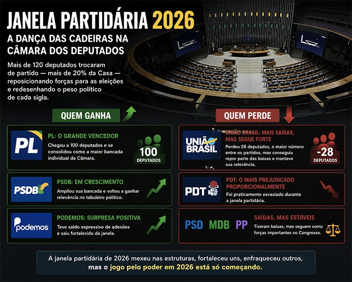 Imagem gerada por IA A janela partidária de 2026 provocou uma verdadeira dança das cadeiras…