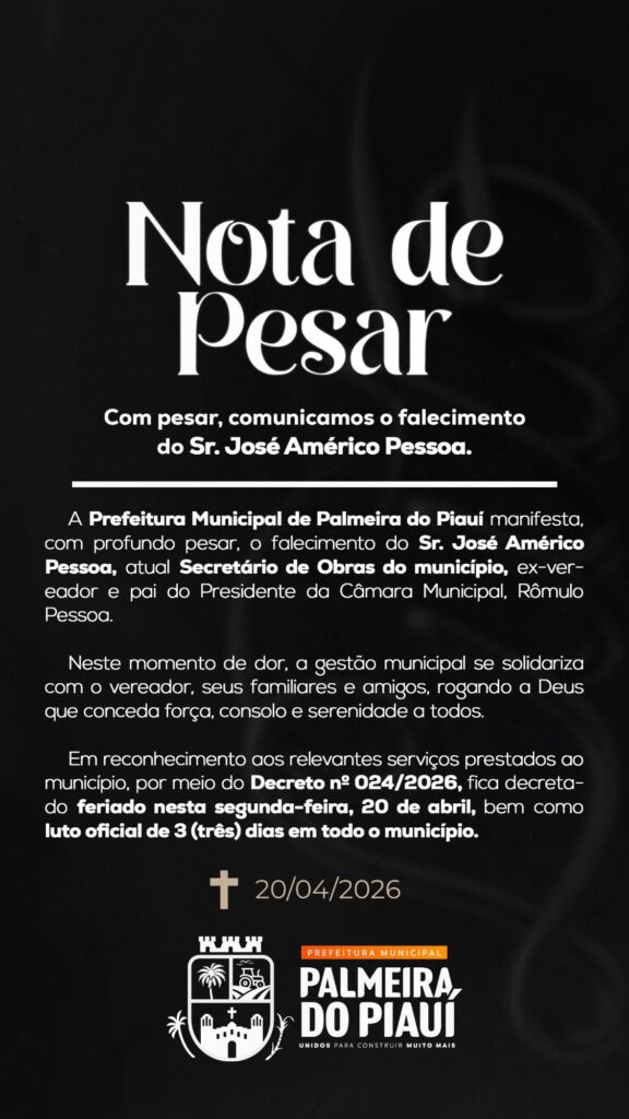 PALMEIRA DO PIAUÍ – A Prefeitura Municipal de Palmeira do Piauí confirmou, na manhã desta segunda-feira (20 de abril), o falecimento do Sr. José Américo Pessoa, atual Secretário de Obras do município e figura de grande relevância na política local.